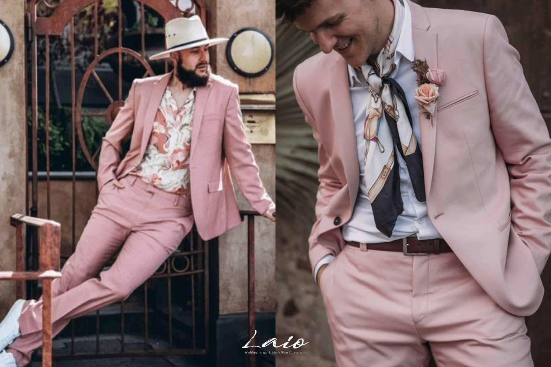男生的剛硬與柔和的粉色有了強烈對比,讓粉色西裝穿上身後有了出乎意料的個性。穿上了粉色西裝也有如沐春風般,為身邊帶來一股充滿幸福與柔軟的氣息。